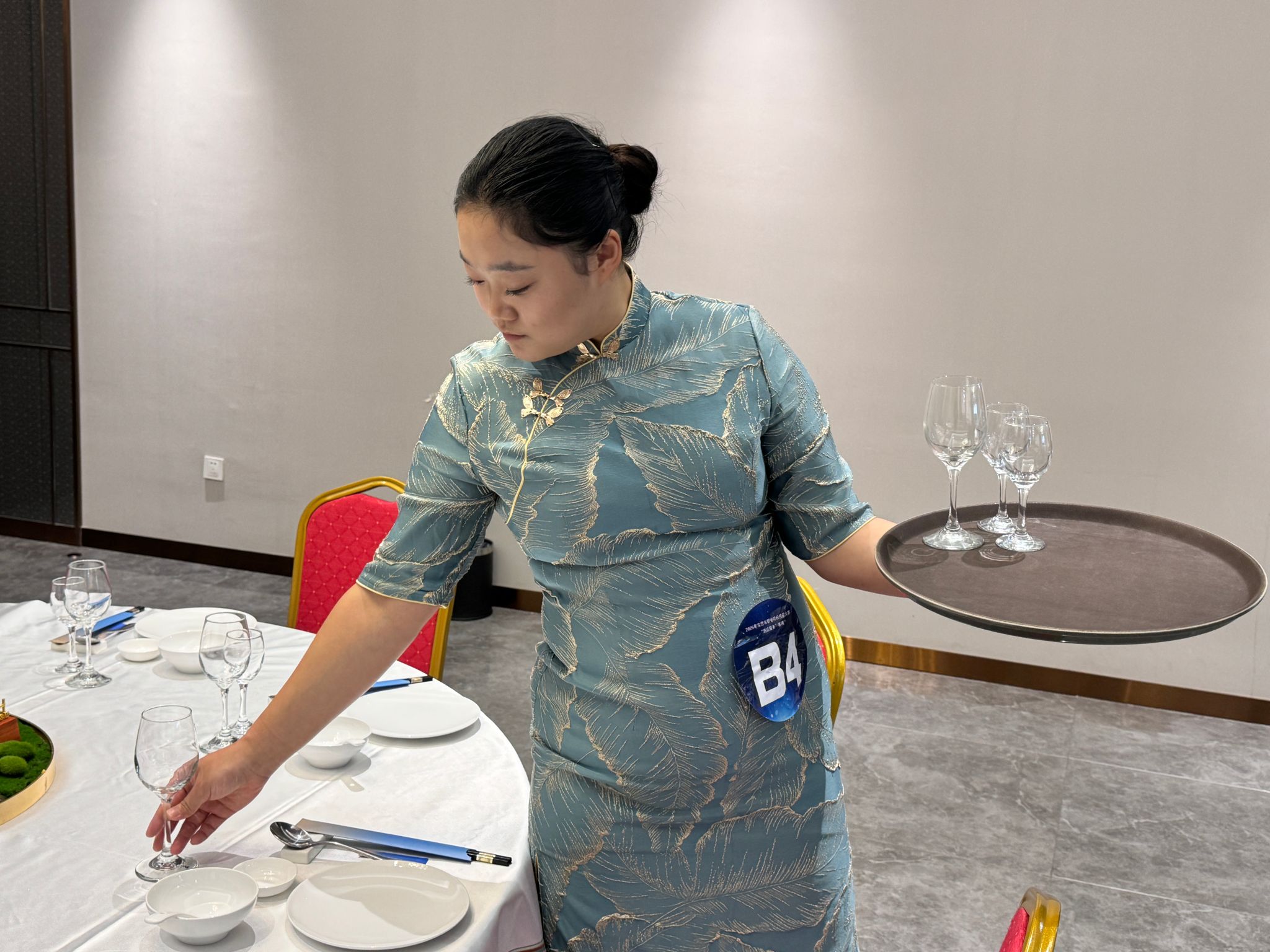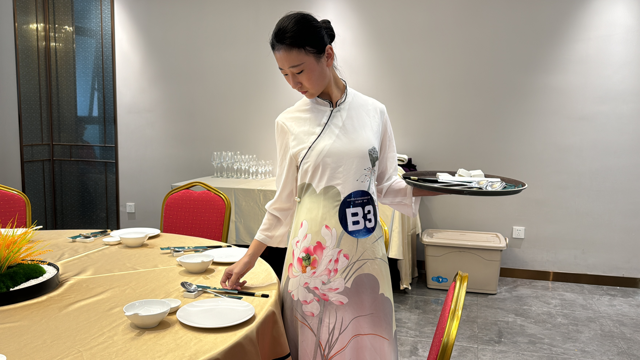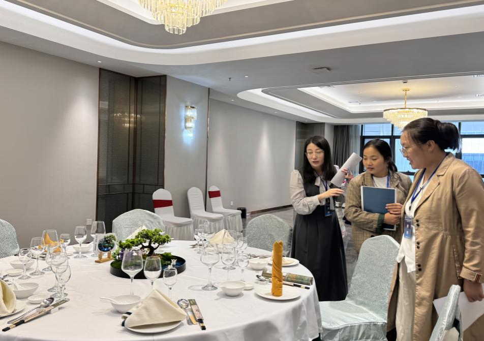 赛场之上,各参赛选手围绕多维度考核展开激烈角逐。中西餐服务环节,选手们以优雅的托盘姿势精准完成摆台,餐具间距误差不超1厘米,搭配创意花艺与杯具组合尽显专业审美;前厅服务比拼中,面对模拟客诉、入住登记等真实场景,选手们凭借清晰的沟通逻辑、娴熟的数字化系统操作与灵活的应急处置能力,展现出扎实的岗位适配力。“从仪容仪表到服务话术,每一处细节都体现着‘精益求精’的工匠精神。”赛事裁判长表示,本次竞赛不仅考察操作技能熟练度,更注重选手服务意识与职业素养的综合评定。