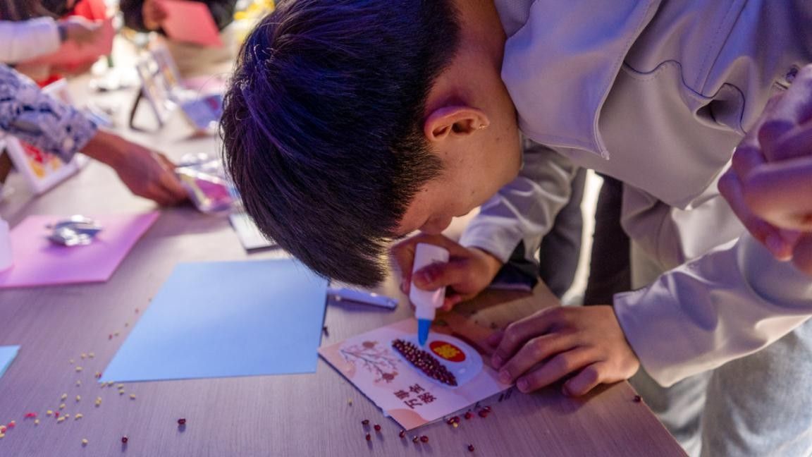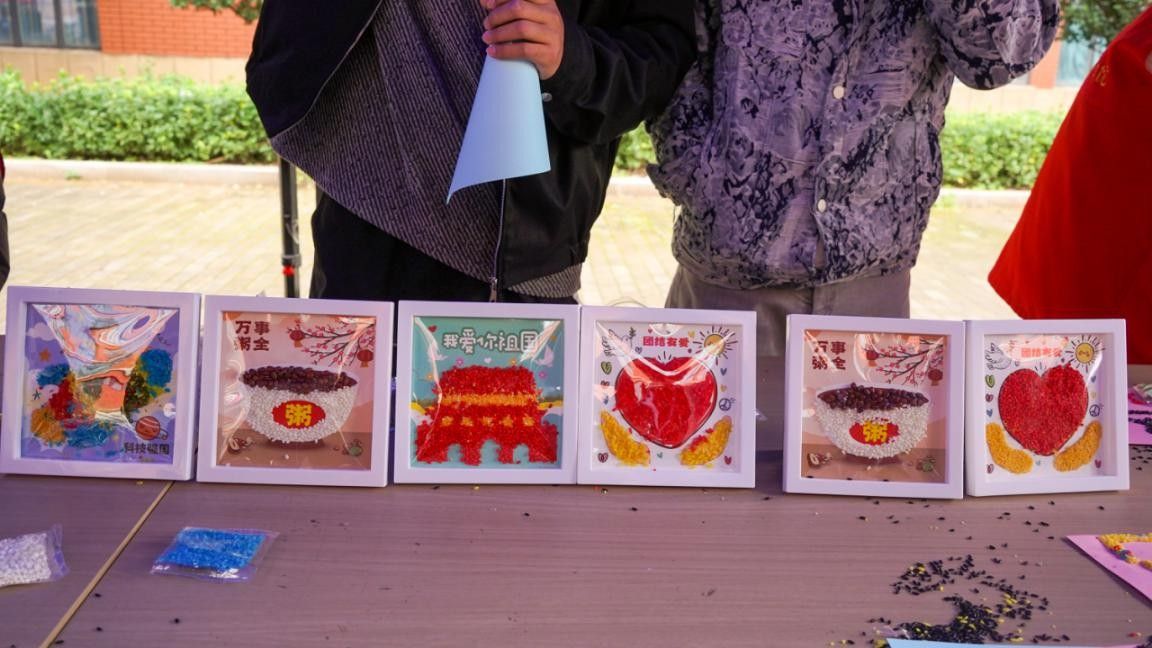 活动现场,“粮食画创作”区格外引人注目。同学们以红豆、绿豆、小米、玉米等各式谷物为媒介进行艺术创作。一幅幅由粮食拼贴出的丰收图景、节约标语栩栩如生,吸引了大量师生驻足欣赏。同学们在亲手创作的过程中,不仅感受到了农耕文化的魅力,更将珍惜粮食的情感倾注于指尖,真正体现了“粮画传情”的深刻内涵。