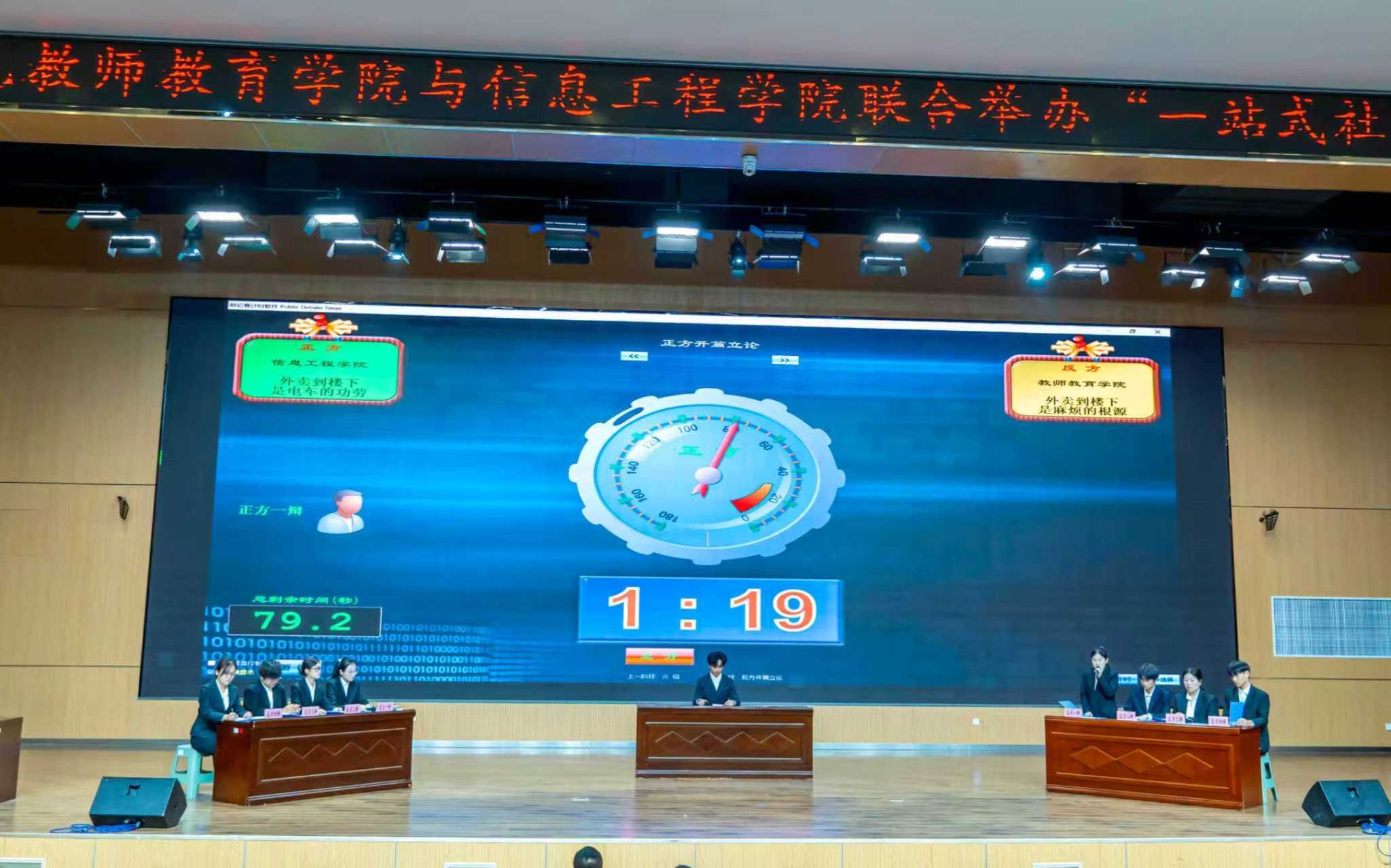 开幕式的高潮为围绕“外卖到楼下是电车的功劳/麻烦的开端”展开的主题辩论赛。正反双方辩手在立论、攻辩、自由辩论和总结陈词等环节中展开激烈交锋,以逻辑与语言探讨科技便利与社区治理的平衡,引发观众深入思考。信息工程学院院长王婧对比赛进行专业点评,徐兴习宣布比赛结果。