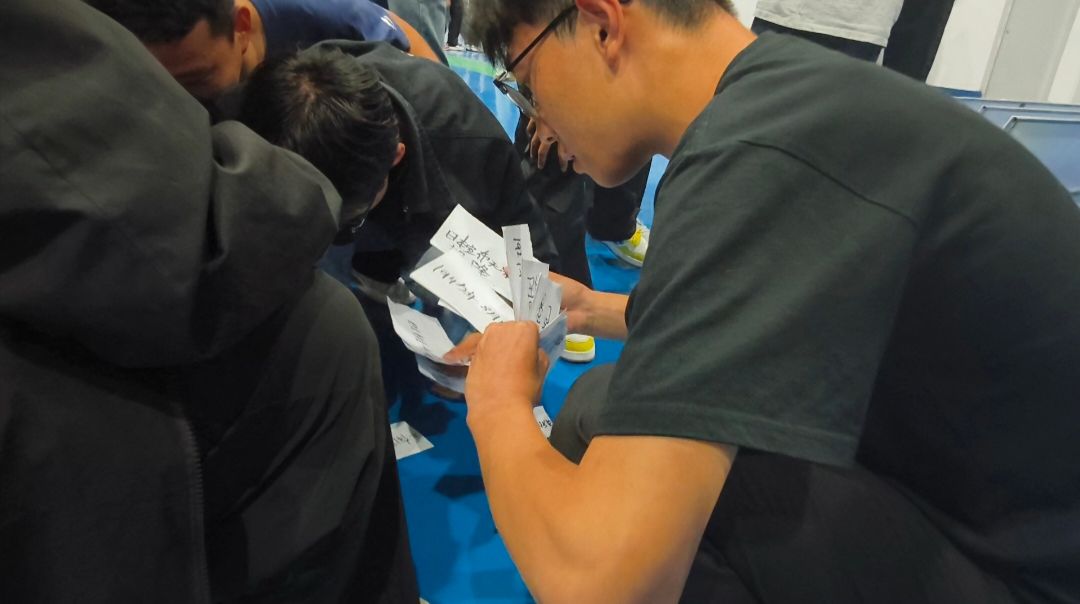 游园会现场,“鸡毛信传递”“emoji猜历史”“记忆碎片墙”和“支援前线”四个主题游戏区有序展开,同学们在红色氛围中踊跃参与。有人屏息凝神,在记忆碎片墙前快速翻找历史卡片;有人欢声不断,在emoji猜谜中碰撞思维火花;更有人在"支援前线"环节中默契配合,迅速集齐物资,展现出高度的团队精神。整场活动既洋溢着节日的欢愉,又充满了历史的厚重,让爱国情怀在互动体验中自然流淌。