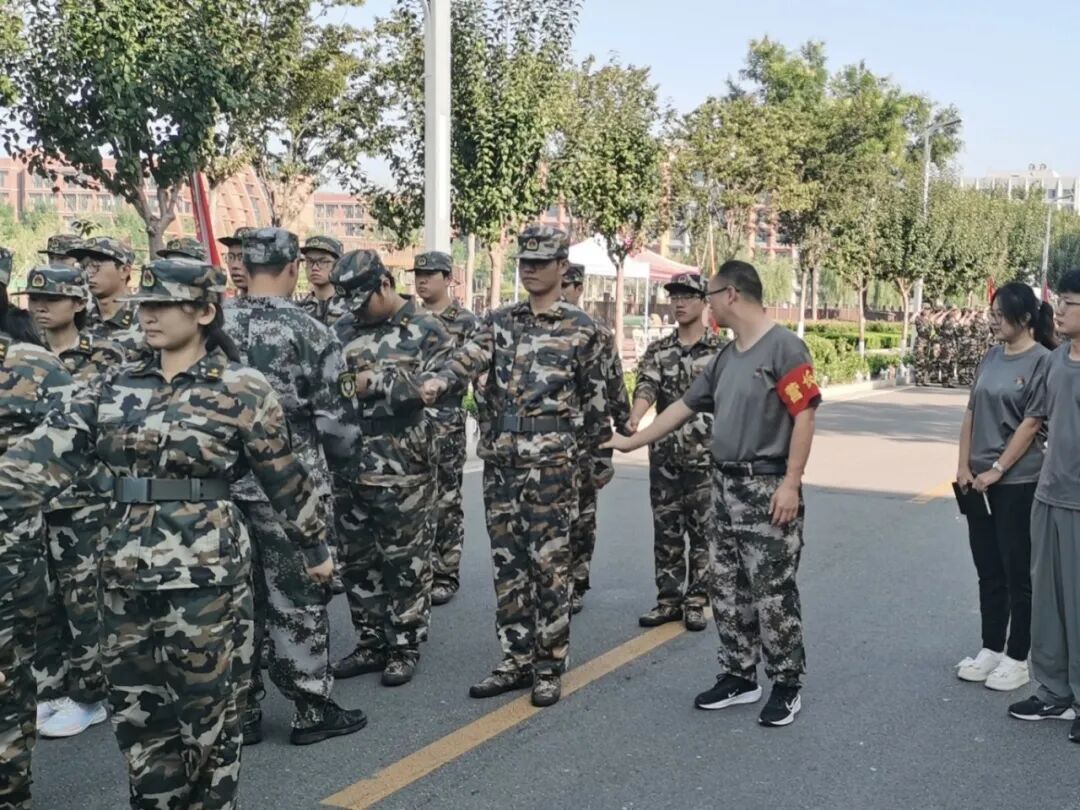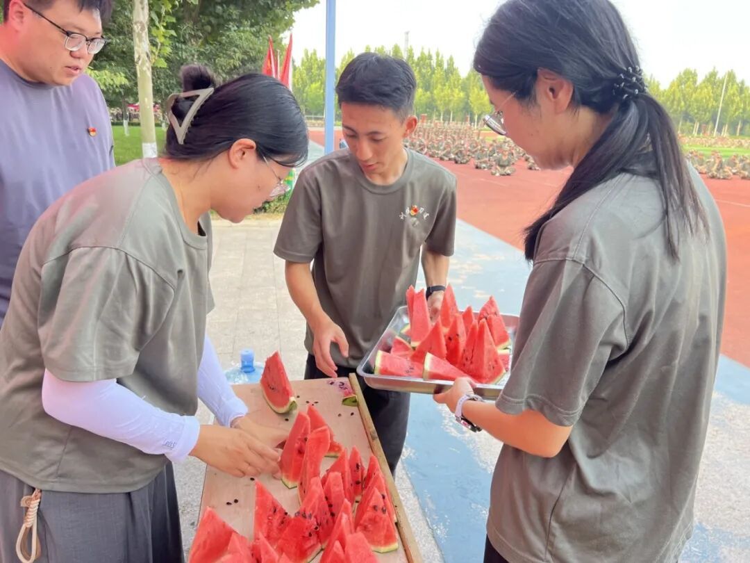 军训期间,党员教师们成为训练场上的“红色坐标”。各二级学院党支部专门设立党员志愿服务岗,为新生送上全方位的贴心关怀。岗上准备了解暑饮品与常用药品,一旦有新生出现身体不适,便第一时间上前帮扶。部分党员教师在训练场上主动参与队列训练,面对新生关于军训流程的疑问,他们耐心解答;看到动作不规范的新生,他们细致指导;察觉有人因训练压力面露难色,他们及时上前疏导情绪。